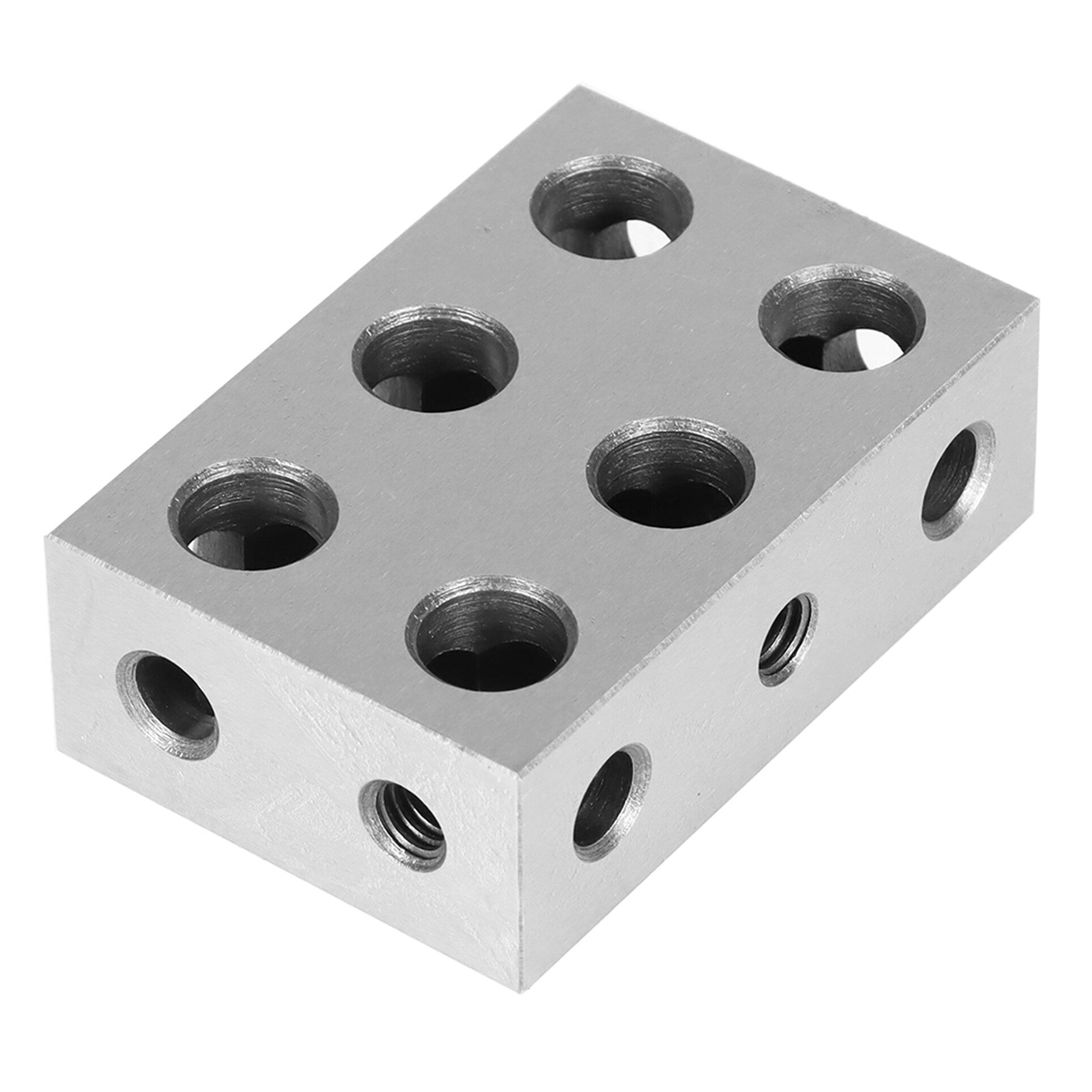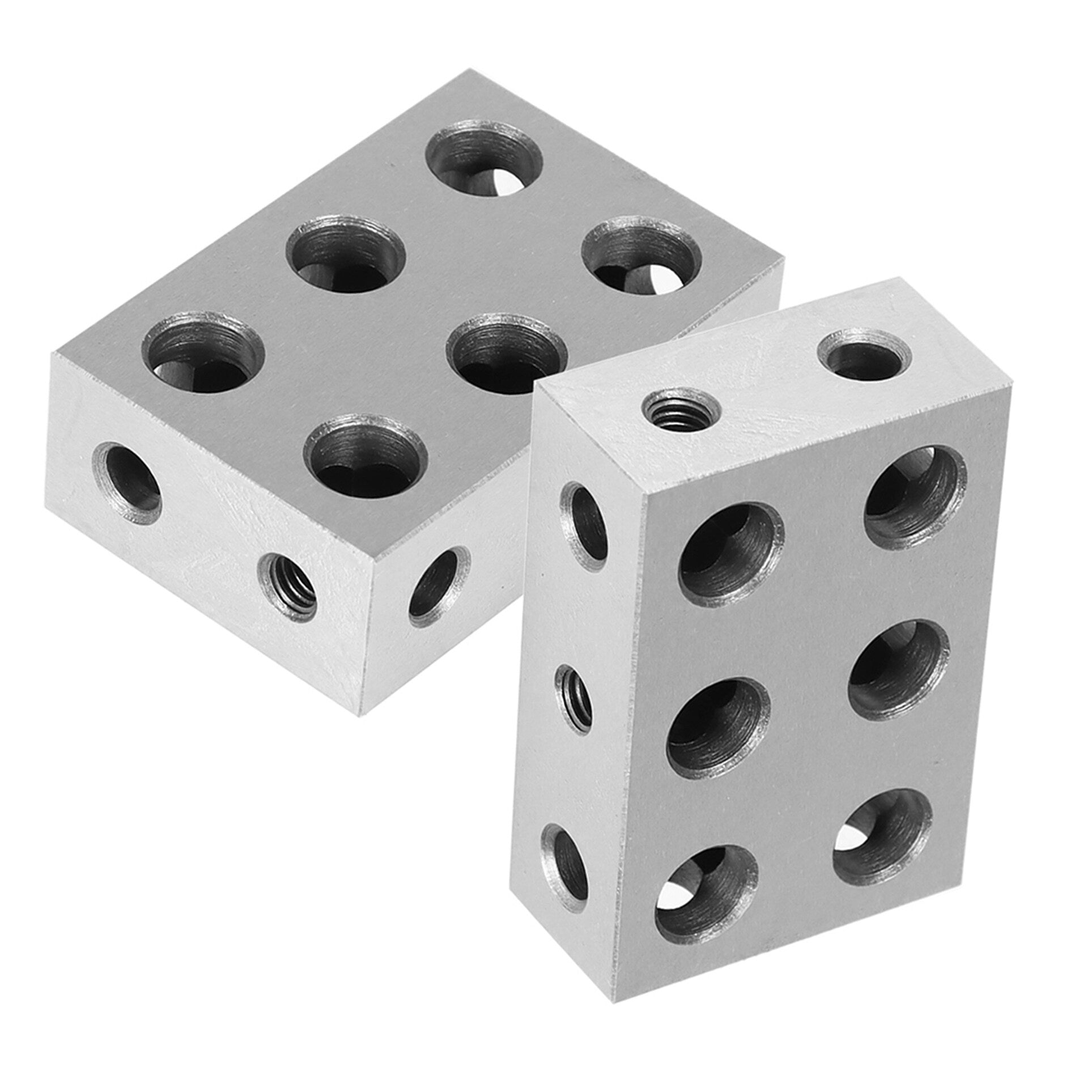 1 X 2 X 3" Universal Block Sets in matched pairs have nearly identical dimensions which makes them ideal for spacing work pieces up off the milling table or supporting them clamped to an angle block. They are similar to parallels, but more stable & may be used outside a vise. Utilizing the pre-drilled holes, their applications are expanded by bolting them together. Our high quality 1 x 2 x 3 inch blocks are also hardened & ground.