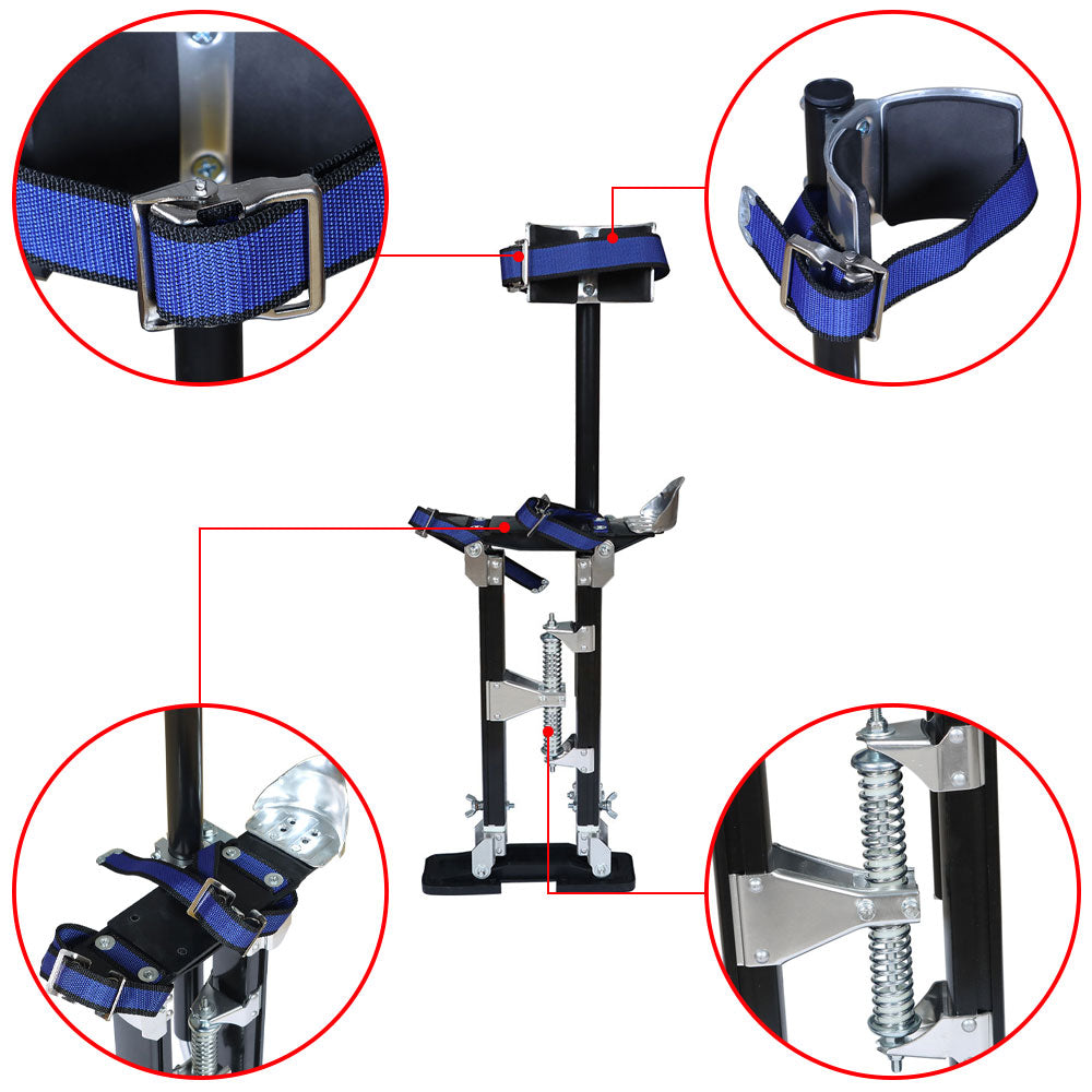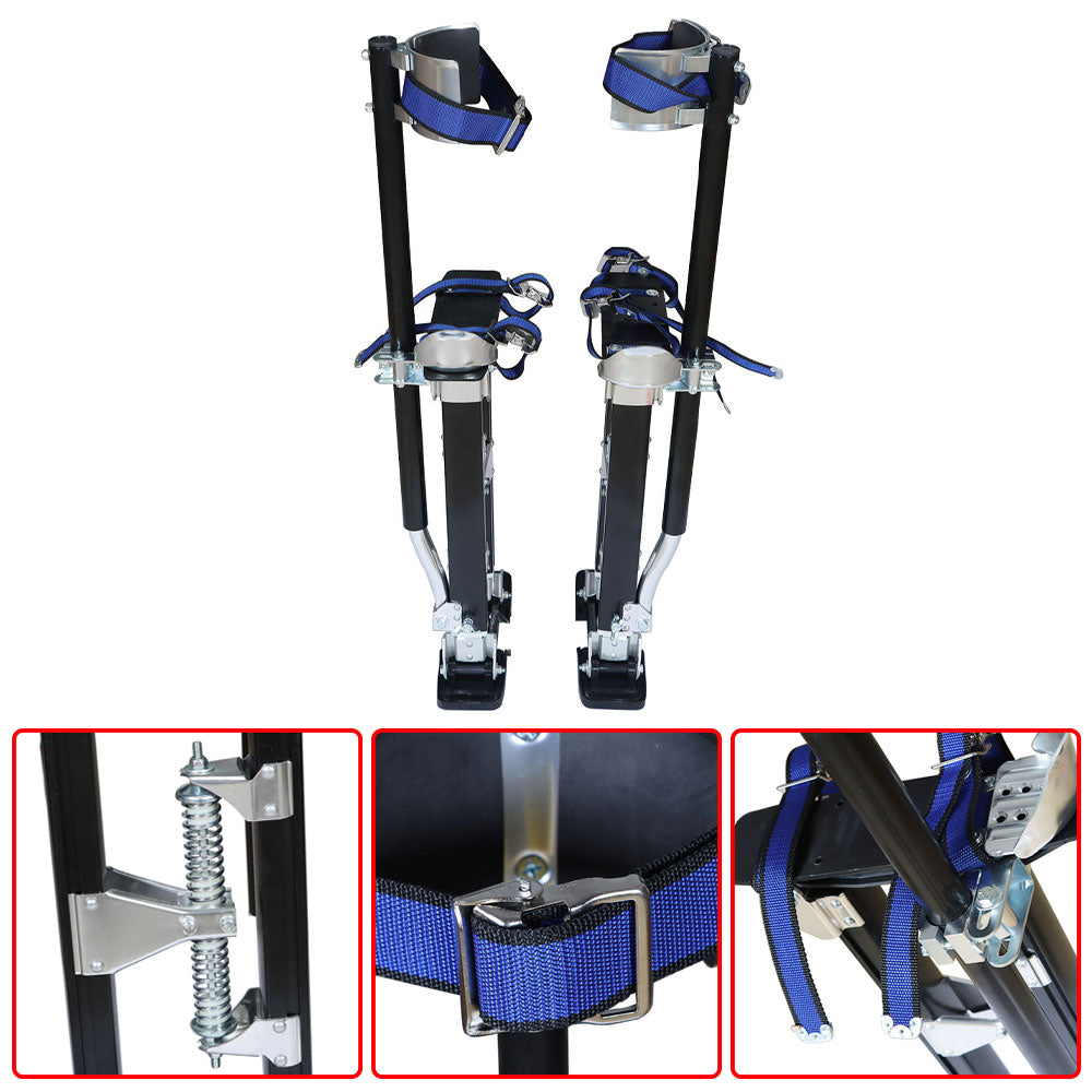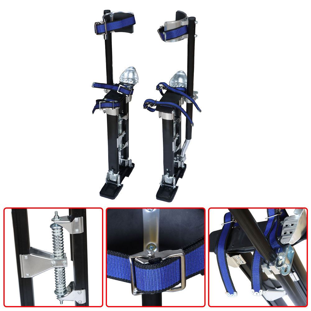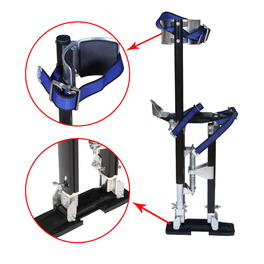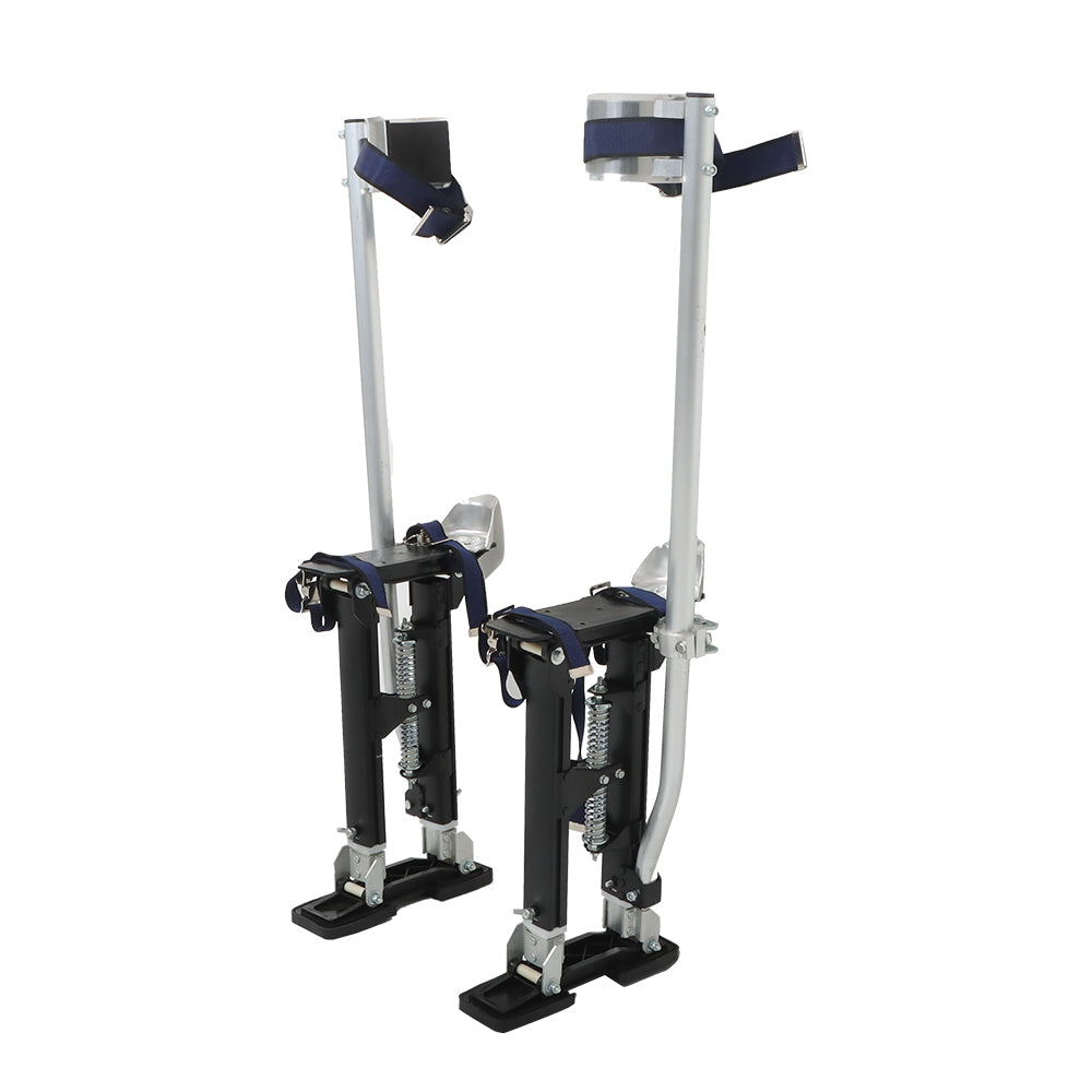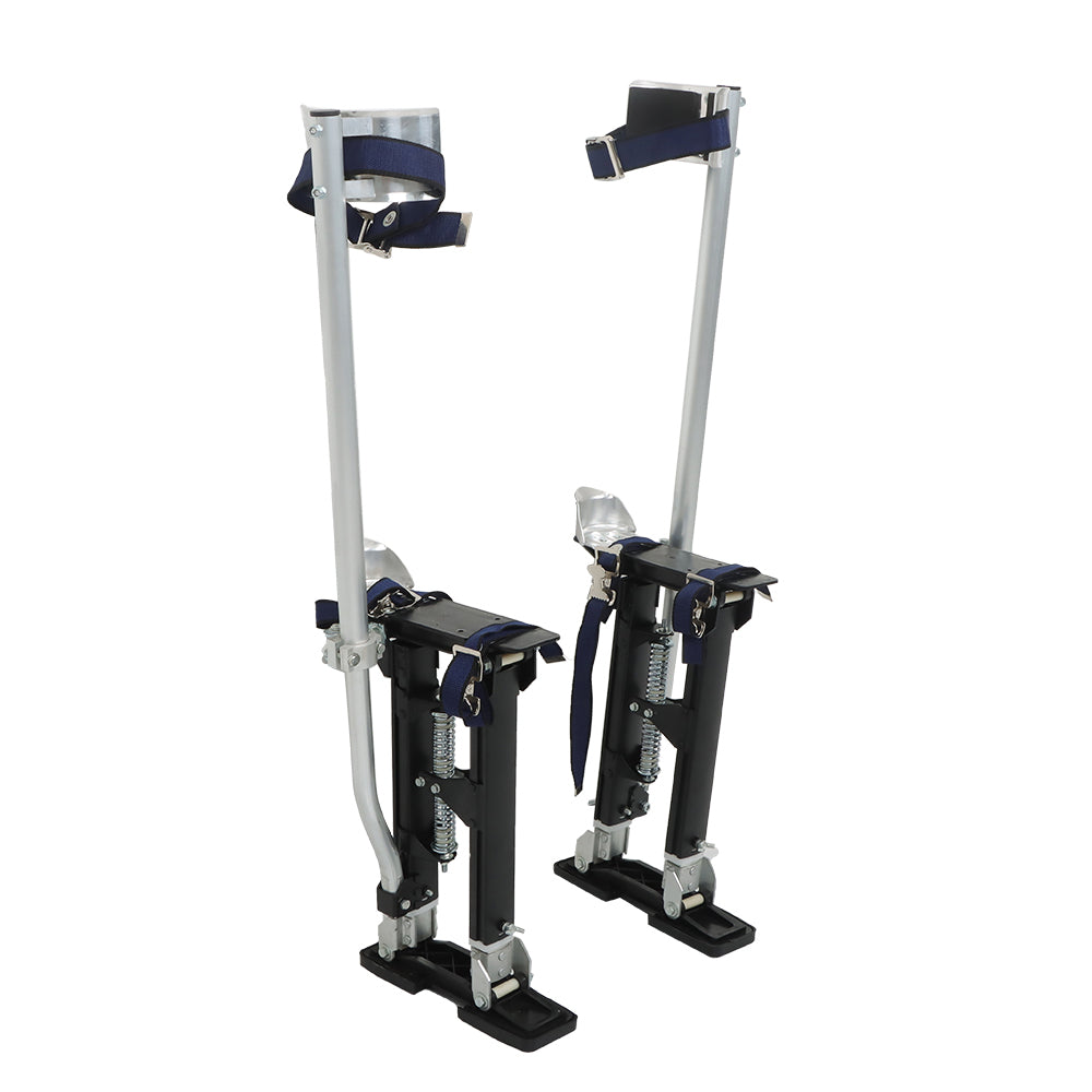 These premium drywall stilts are built for professionals and suitable for drywall taping, painting, wiring, and much more. Precision manufactured from high-grade aluminum, these stilts are light enough to use all day, but sturdy enough to last for years. A non-rocking frame with overlapping, industrial strut tubes is paired with an adjustable dual-spring flex-system for excellent mobility. The height is adjustable using a wing-nut design; no tools are required to change the height. The shoe and leg straps are fully-adjustable with auto-locking buckles for quick stilt use/removal, and extra-wide padded calf braces plus three-position adjustable heel plates accommodate any user (stilts have 1 calf brace). The bases are made in large, textured, high-grade material that is non-marring to protect floors. Minor assembly required. Construction: Aluminum. Color: Black