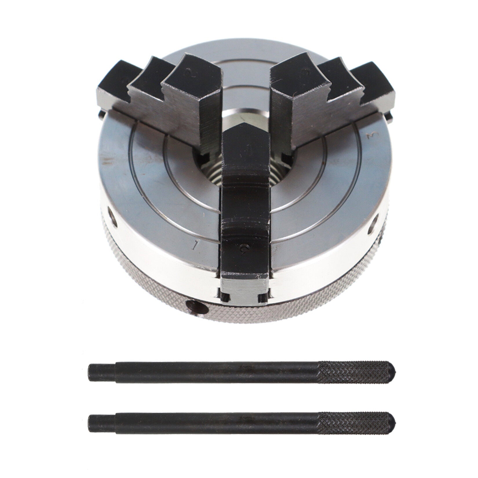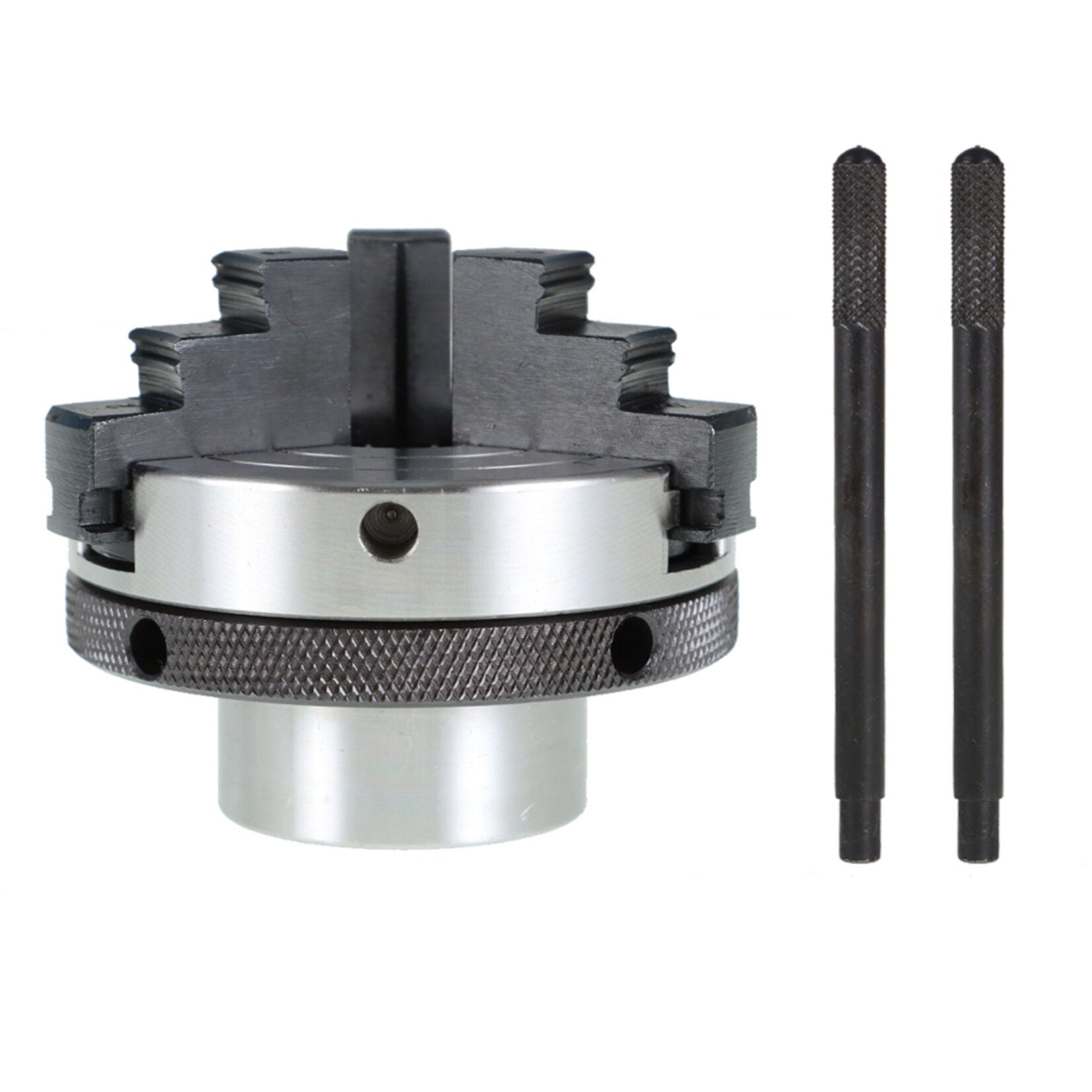 The stepped jaws are reversible for added versatility and come in handy when turning over-sized material. No need to worry about keeping track of a small chuck key as adjusting the jaws for different material simply requires a twist of the knurled adjustment plate.