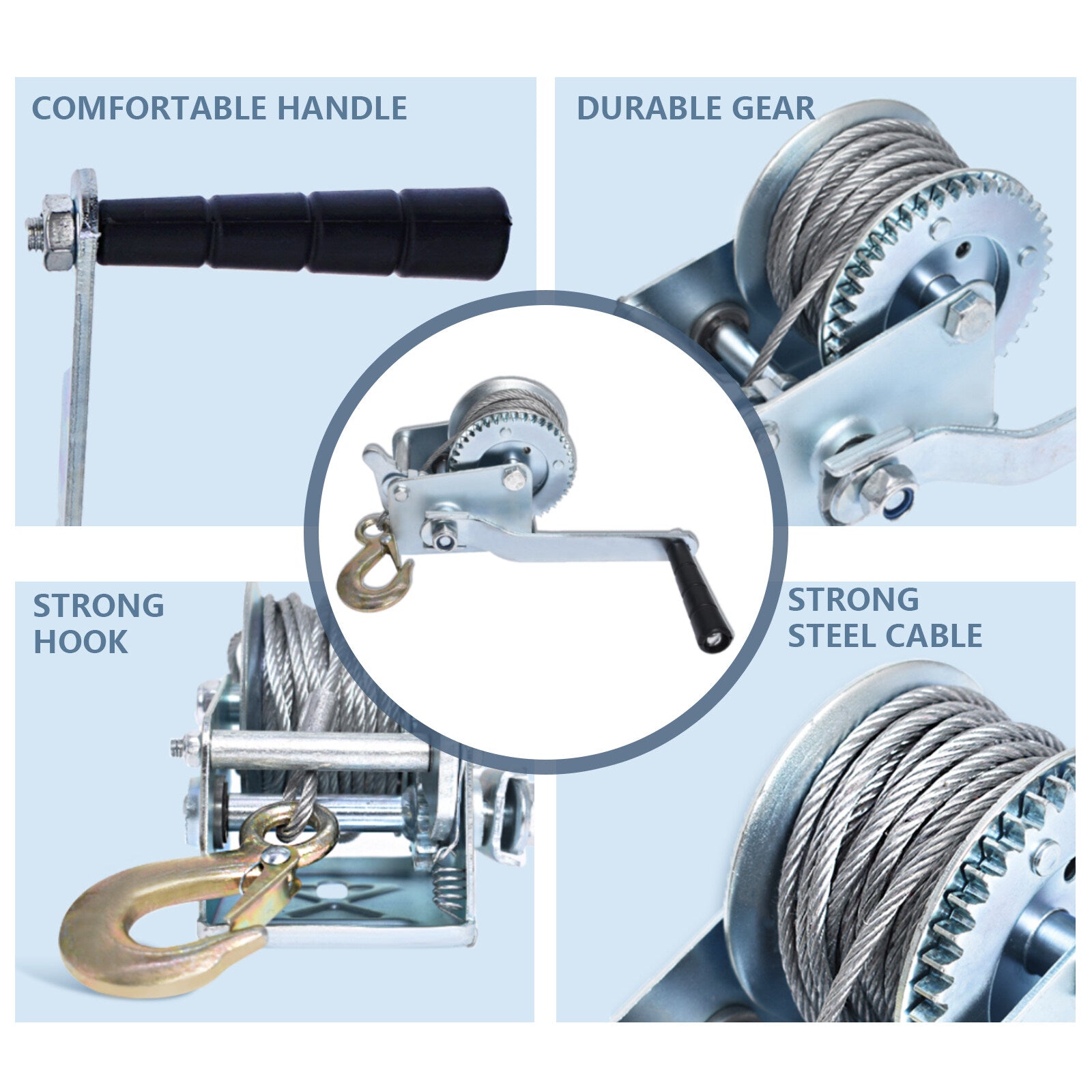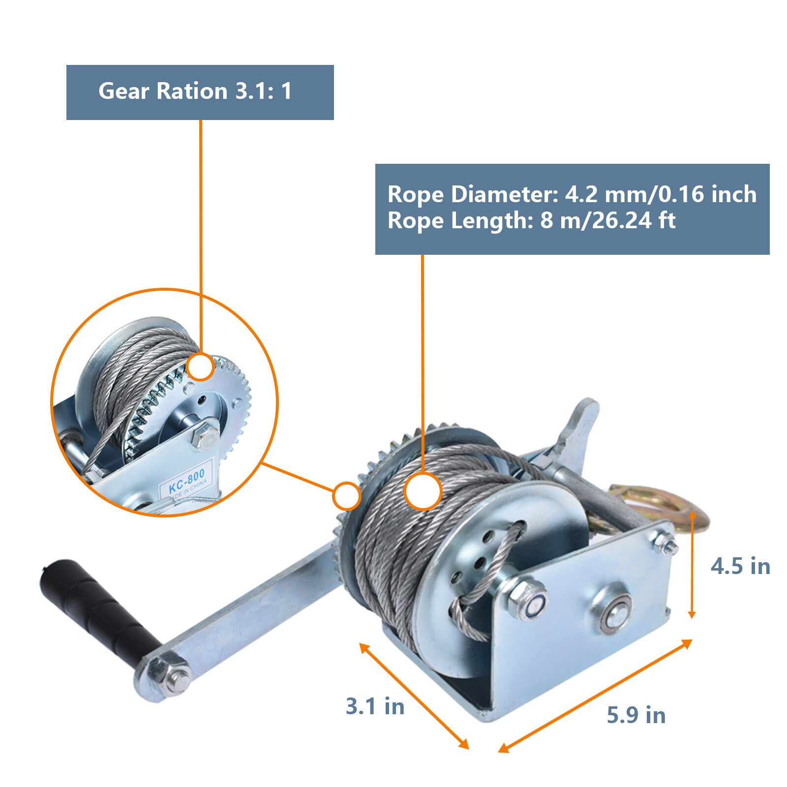 Heavy Duty Hand Winch 600Lbs Hand Crank Strap Gear with 8m Steel Wire Manual Operated Two-Way Ratchet ATV Boat Trailer Marine for Trailering or Loading Boats Personal Watercraft and Lawn Equipment